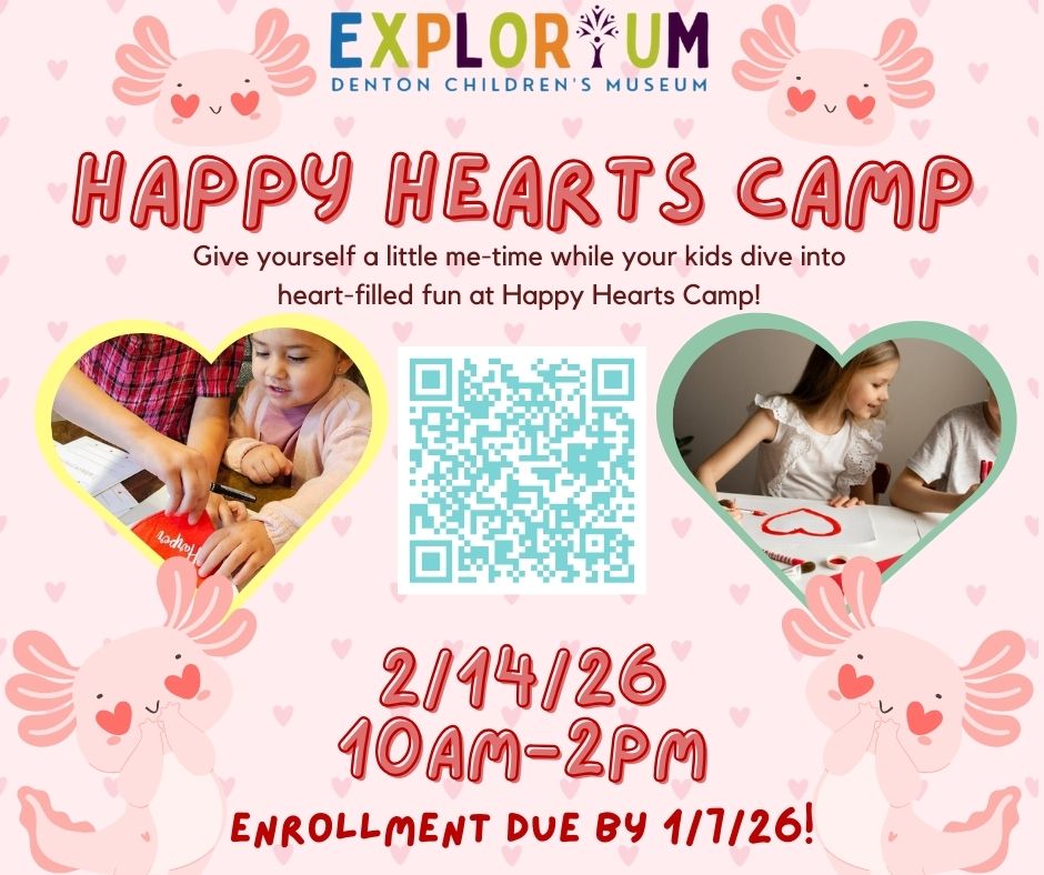 Sierah Hanes2026-01-15T18:45:54+00:00Hey parents! Looking for a sweet way to celebrate Valentine’s Day? 💕 Drop your kids off at Explorium Denton’s Children’s Museum for our Happy Hearts Camp on February 14th! Designed for kids ages 5–11, this fun-filled camp is packed with hands-on, Valentine’s-themed experiments, creative activities, and lots of happy heart